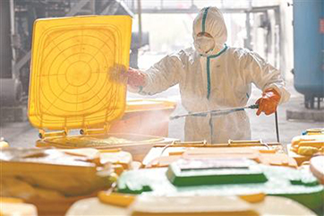 新冠肺炎疫情發(fā)生后,每天產(chǎn)生的巨量醫(yī)療廢物成為武漢市亟待解決的重要問題。圖為近日,在武漢市青山區(qū)云峰公司,工作人員在對(duì)醫(yī)療廢物轉(zhuǎn)運(yùn)箱消毒。新華社記者 才揚(yáng) 攝3月11日,記者從國務(wù)院聯(lián)防聯(lián)控機(jī)制新聞發(fā)